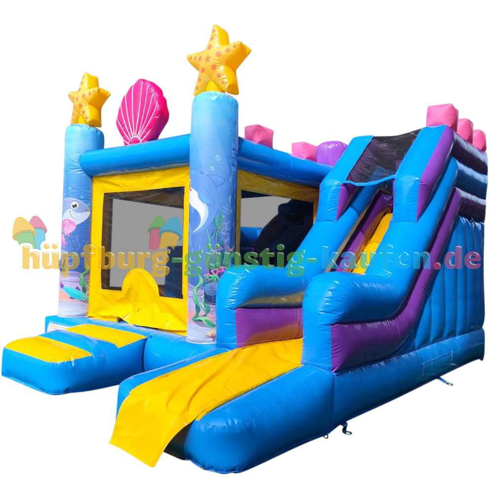 La structure gonflable colorée avec toboggan Badenixe transporte les enfants directement dans un monde sous-marin rempli d’adorables poissons et de sirènes. Le toboggan extra long sur le côté transforme une simple structure gonflable en un véritable paradis de jeux. La conception soignée et les couleurs romantiques complètent le design et le rendent unique en termes de détails. Le toit au-dessus du toboggan et les filets de sécurité à toutes les ouvertures rendent la structure gonflable très sûre pour toutes les utilisations.